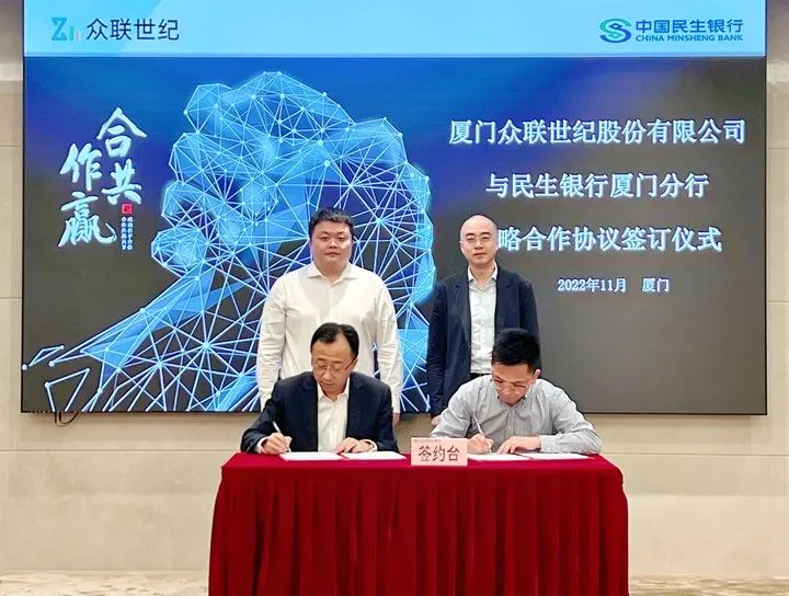 11月24日,厦门众联世纪股份有限公司(以下简称“众联世纪”)与中国民生银行股份有限公司厦门分行(以下简称民生银行厦门分行)签署战略合作协议。民生银行厦门分行党委书记兼行长唐立斌、分行行长助理徐之烜、分行行长助理曹金富、众联世纪董事长兼总经理林欣扬、副总经理骆龙泉等嘉宾出席签约仪式。